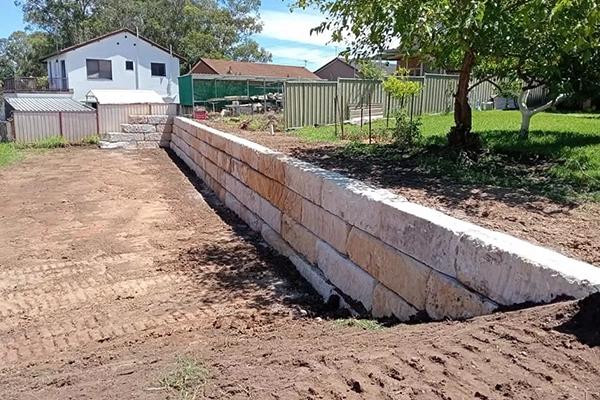 Custom retaining wall construction for structural support, landscaping, and aesthetic enhancement.